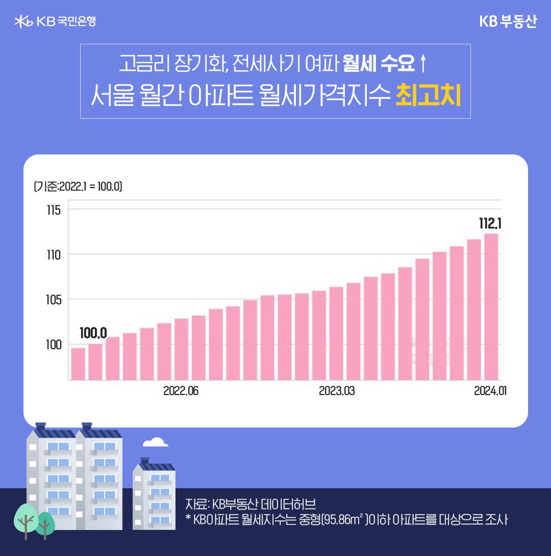 월세수급지수는 월세의 수요와 공급을 나타내는 지표로, 100을 초과하면 수요가 공급보다 많다는 것을 의미합니다. 이는 월세 시장의 과열을 나타내며, 세입자들이 월세를 선택할 수밖에 없는 상황을 반영합니다. 이러한 수치는 서울의 아파트 시장에서 월세가 점점 더 중요한 선택지가 되고 있음을 보여줍니다.
